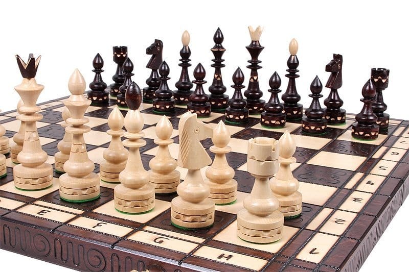 Jeu d’Echecs en Bois de Charme et de Sycomore + Echiquier en Bois de Hêtre – Combo Royal 36cm